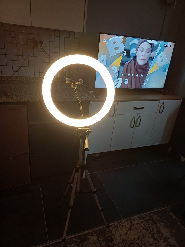 Bej renkli tripod, halka ışık ve telefon tutucusuyla selfie ve video çekimleri için uygundur. Ayarlanabilir yükseklik ve sağlam taban.