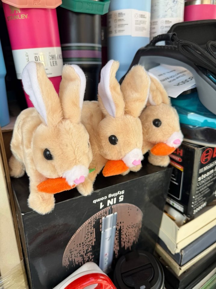 Bej renkli, yumuşak tüylü tavşan peluş oyuncaklar. Turuncu havuç tutuyor, siyah gözlü ve pembe burunlu sevimli figürler.