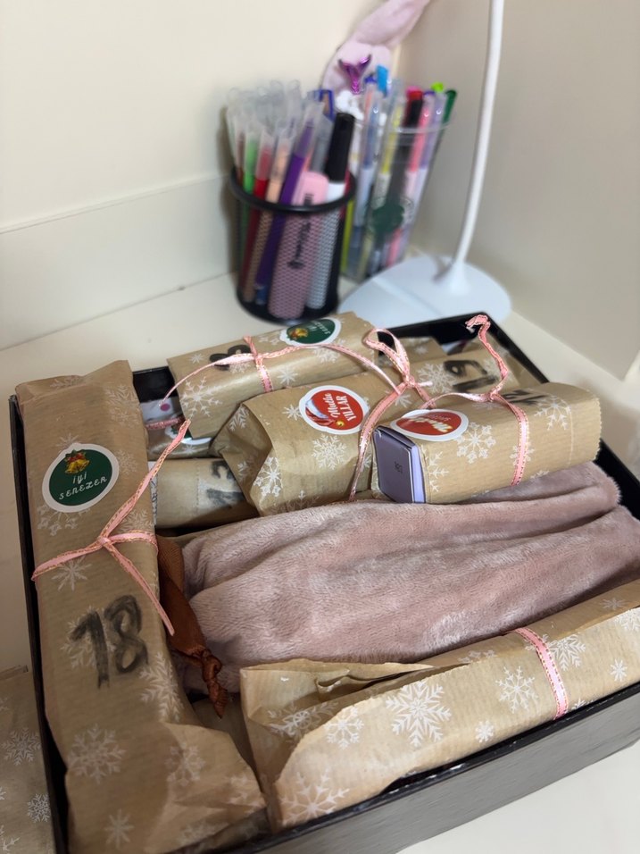 Bej renkli kar tanesi desenli kağıda sarılı, pembe iplerle bağlanmış hediye paketi seti.