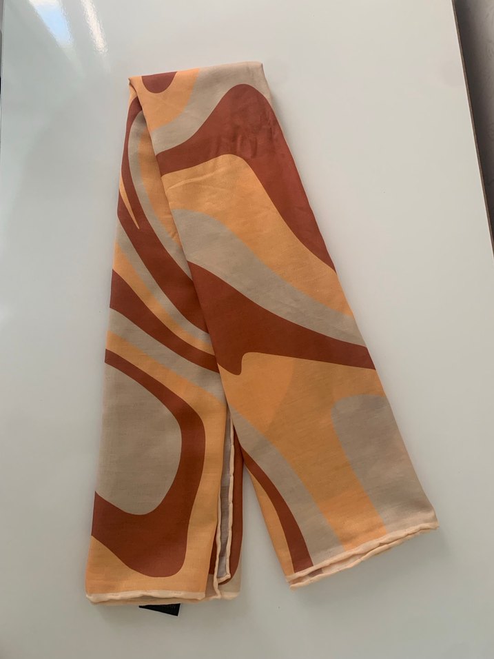 Drapeli, ipek görünümlü kumaştan yapılmış bej ve kahverengi tonlarında, çağdaş bohem tarzda kadın eşalp.