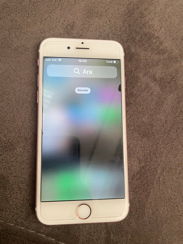 Pastel tonlarda bej renkli iPhone, ana ekran düğmeli ve ekranda Türkçe arama ve düzenleme seçenekleri görünmekte. Ekranında ufak bi kararma var,faturası ve kutusu mevcut