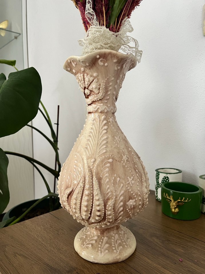 Bej renkli, pastel tonlarda kabartmalı desenlere sahip, geniş ağızlı vazo. Her ortama zarif bir dokunuş katar.