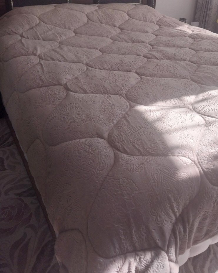 Bej renkte, kabartmalı dokulu yatak örtüsü aynı zamanda yorgan olarak da kullanılır. Yenidir