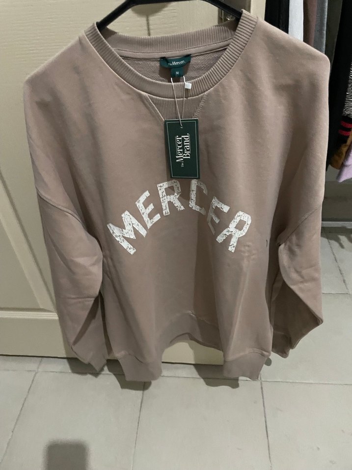 Kadınlar için bej renkli, uzun kollu, yuvarlak yakalı, baskılı ve örme kumaştan rahat kesim sweatshirt.
