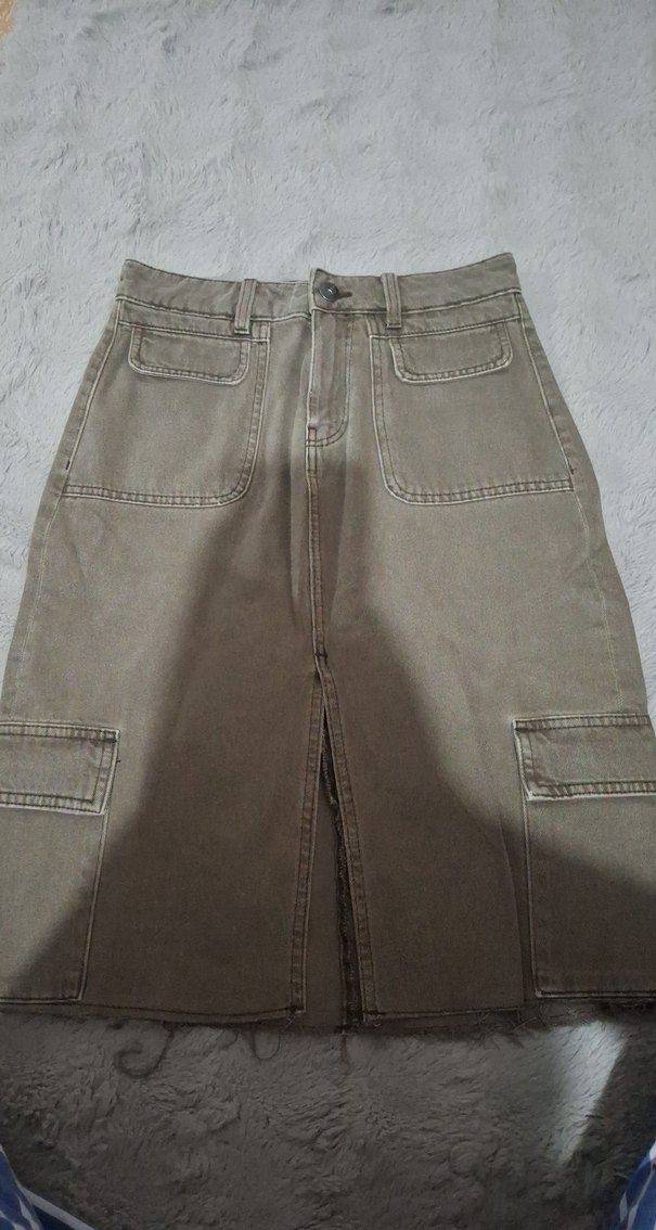 Bej renkli midi boy, bol kesim kadın denim etek. Ön cepler ve ön yırtmaç detaylarıyla günlük sokak stili sunar. hm 34 beden