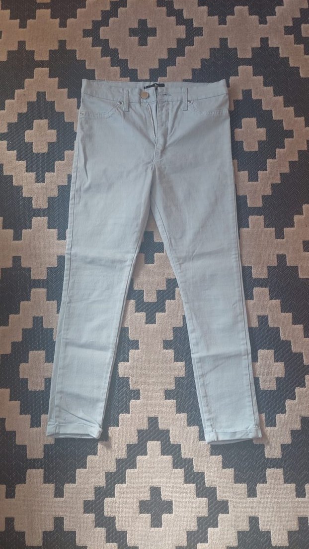 Bej renkli denim pantolon, normal boy ve regular fit ile rahat ve gündelik kullanım için uygun, desensiz ve normcore tarzında.