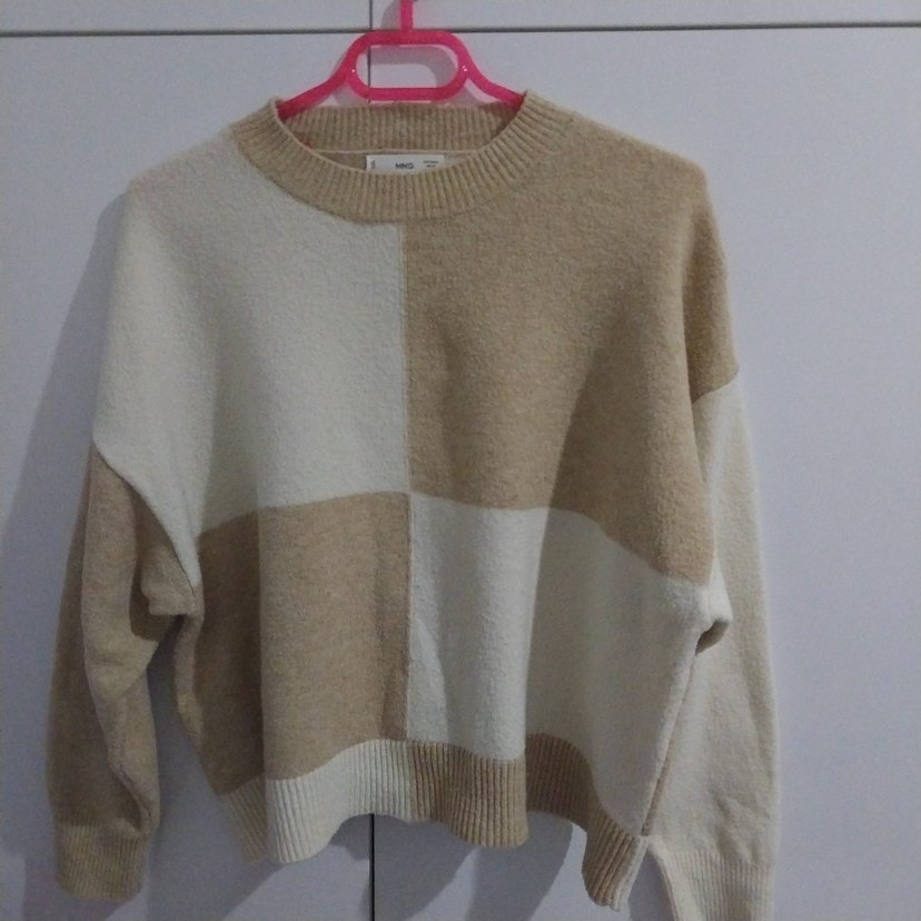 Bej renkli, yuvarlak yaka ve uzun kollu örgü kazak. Rahat kesimi ve renk bloklu deseni ile günlük kullanıma uygundur.