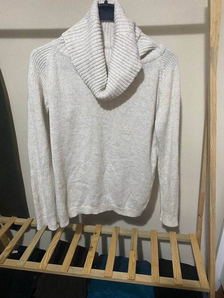Bej örgü kazak, yüksek boğaz ve uzun kollu tasarıma sahiptir. Rahat ve bol kesimi, günlük kullanıma uygundur. Yumuşak ve sıcak dokusu ile konfor sağlar.