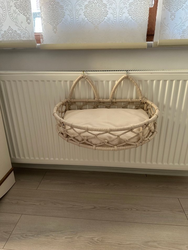 İki saplı askılı, dokuma malzemeden yapılmış açık bej renkli kedi sepeti. İçinde yumuşak bir minder yer alır.