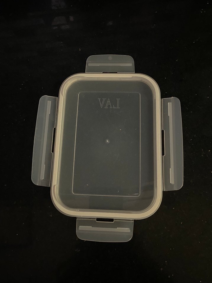 Bej renkte, tüm kenarlarında kilitli kapakları olan LAV işaretli saklama kabı. Yiyecekler için güvenli saklama sağlar.