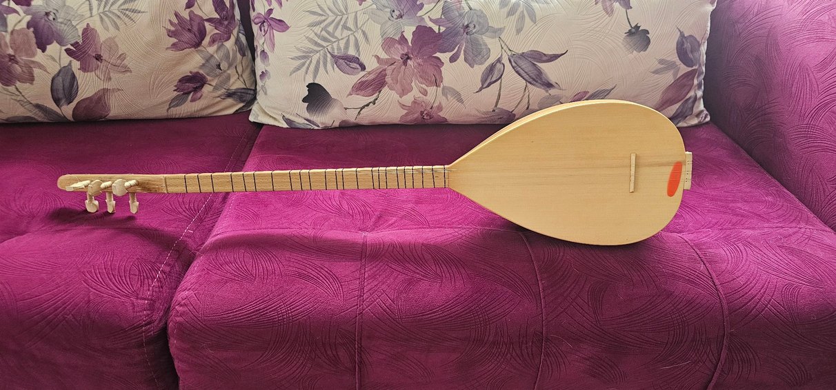 Bej renkli kısa saplı bağlama, renkli tonlarla, pürüzsüz ahşap gövde ve geleneksel tasarıma sahip.