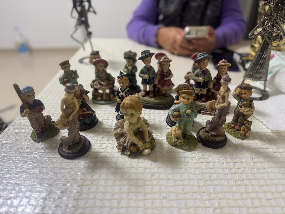 Bej tonlarında, vintage kıyafetler giymiş çocuk figürinlerinden oluşan klasik bir set. 17 parça