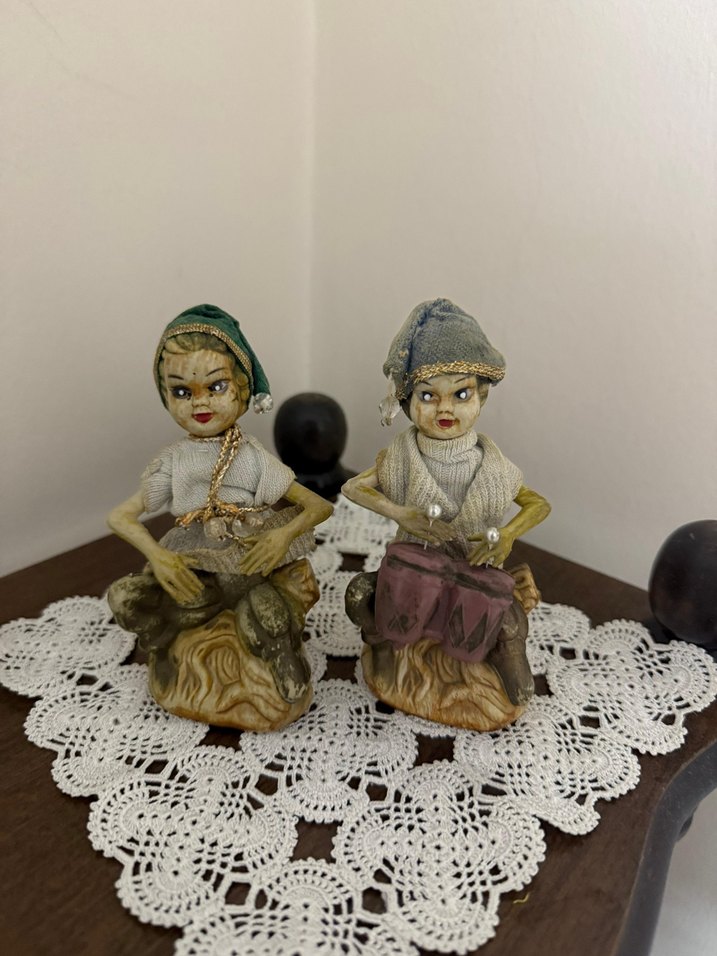 Bej tonlarda, koyu detaylı, vintage kıyafet ve şapka giymiş iki figürin, dokulu tabanlar üzerinde oturuyor. Mekana nostaljik bir hava katıyor.