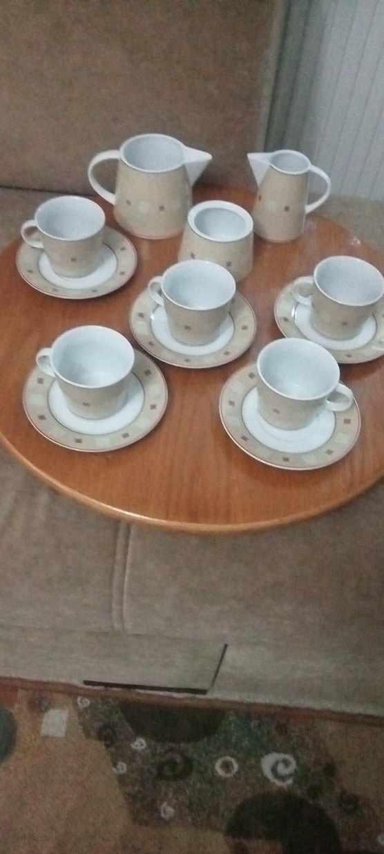 Bej renkte, sade desenli kahve fincanları, tabakları ve sütlüklerden oluşan klasik bir set. ☕