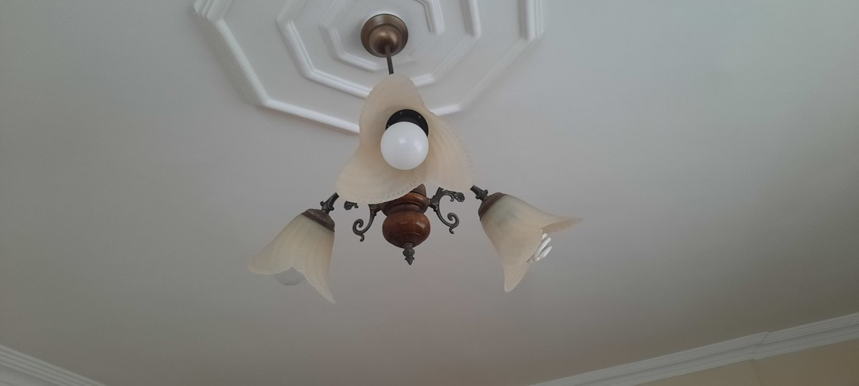 Bej renkli üç adet açık renk cam abajura ve dekoratif metal detaylara sahip koyu renk ahşap gövdesi bulunan klasik avize.