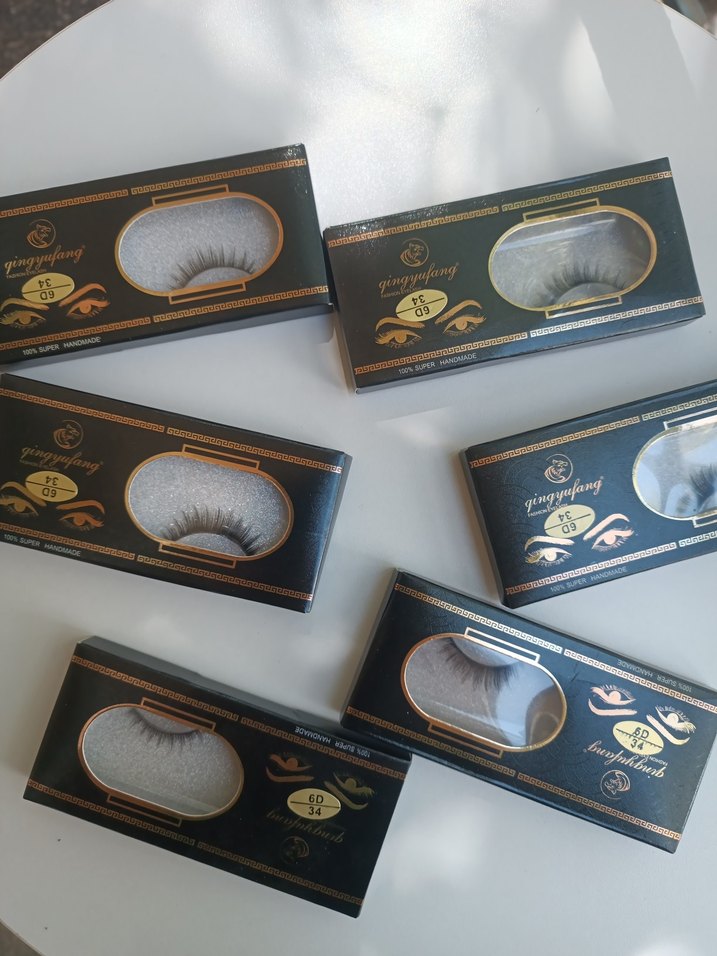 Bej renkli kutularda sunulan koyu takma kirpik seti, göz görünümünü doğal şekilde güçlendirir.