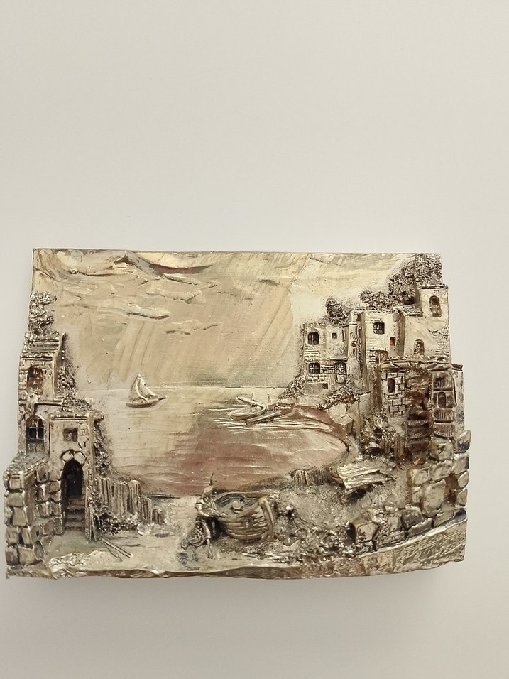 Koyu tonlarda bej renginde, tekneler ve sahil köyü detaylı dokulu deniz manzarası tablosu.