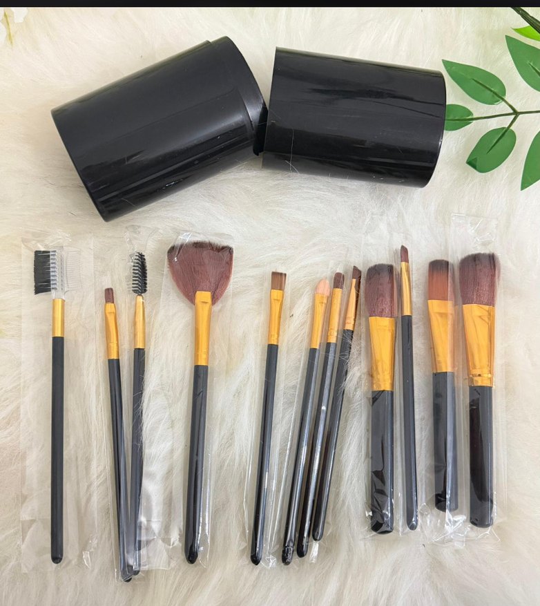 Bej saplı ve koyu kıllı çeşitli makyaj fırçalarından oluşan set. Siyah tutucularla birlikte sunulur. ️