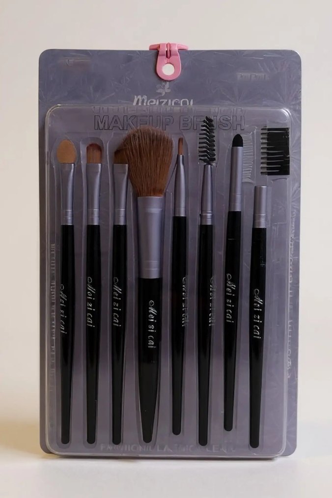 Çeşitli şekillerde, koyu saplı bej renkli makyaj fırçalarından oluşan set. Paket üzerinde 'MAKEUP B' yazısı bulunur. ️