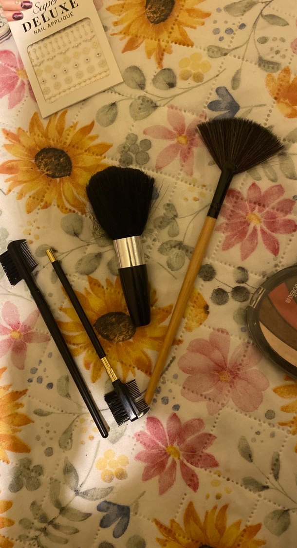 Bej renkte, yelpaze ve pudra fırçası ile kaş tarağı içeren makyaj fırça seti