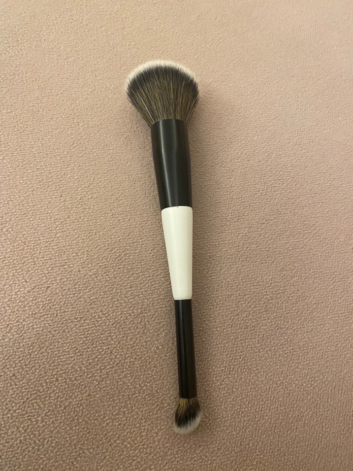 Yumuşak kıllara sahip bej makyaj fırçası, koyu renk sapıyla düzgün uygulama sağlar. ️