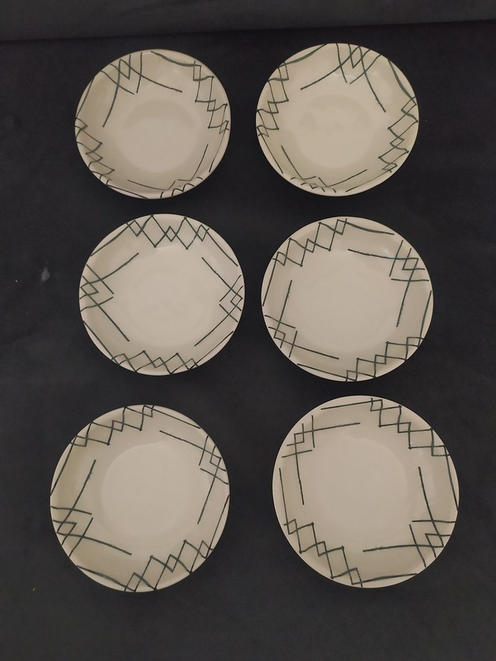 Altı adet bej renkte tabak, kenarlarında koyu renk geometrik çizgilerle modern bir desen sunar. Şık ve sade tasarıma sahiptir. ️
