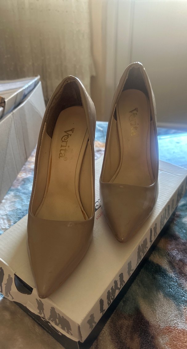 Bej renkli, tokalı, modern klasik tasarıma sahip stiletto topuklu ayakkabı. Ofis kullanımı için uygundur ve Verita markalıdır.