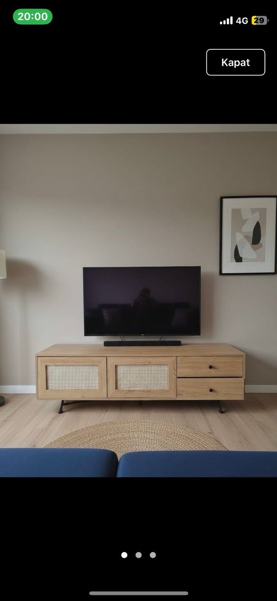 Bej renkli TV ünitesi, iki çekmeceli ve iki hasır kapaklı dolaplı ahşap tasarıma sahiptir. Siyah metal ayaklarla desteklenmiştir. Sağlam hiç kullanılmadı Ölçüleri:180/55cm