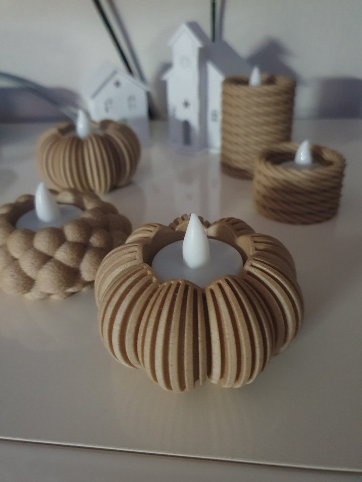 Örgü görünümlü, açık bej renkli mumluklar. Yumuşak ışık veren LED mumlarla sıcak bir atmosfer sağlar. ️