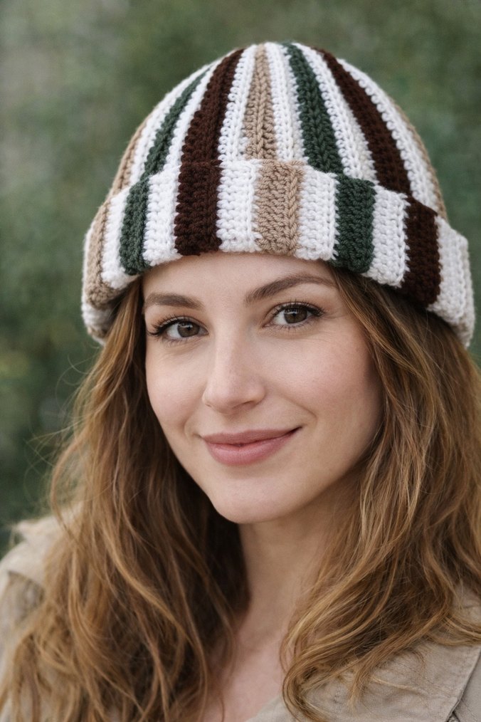 Bej, kahverengi, yeşil ve beyaz çizgili örgü kadın bere, rahat ve retro tarz sunar. Bohem ve hippie görünüme uygundur.