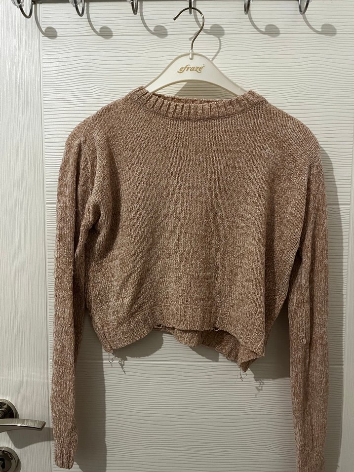 Bej renkli örgü kadın kazak, yuvarlak yaka ve uzun kolludur. Salaş kesimi ve normal boyu ile rahat ve gündelik bir stil sunar.