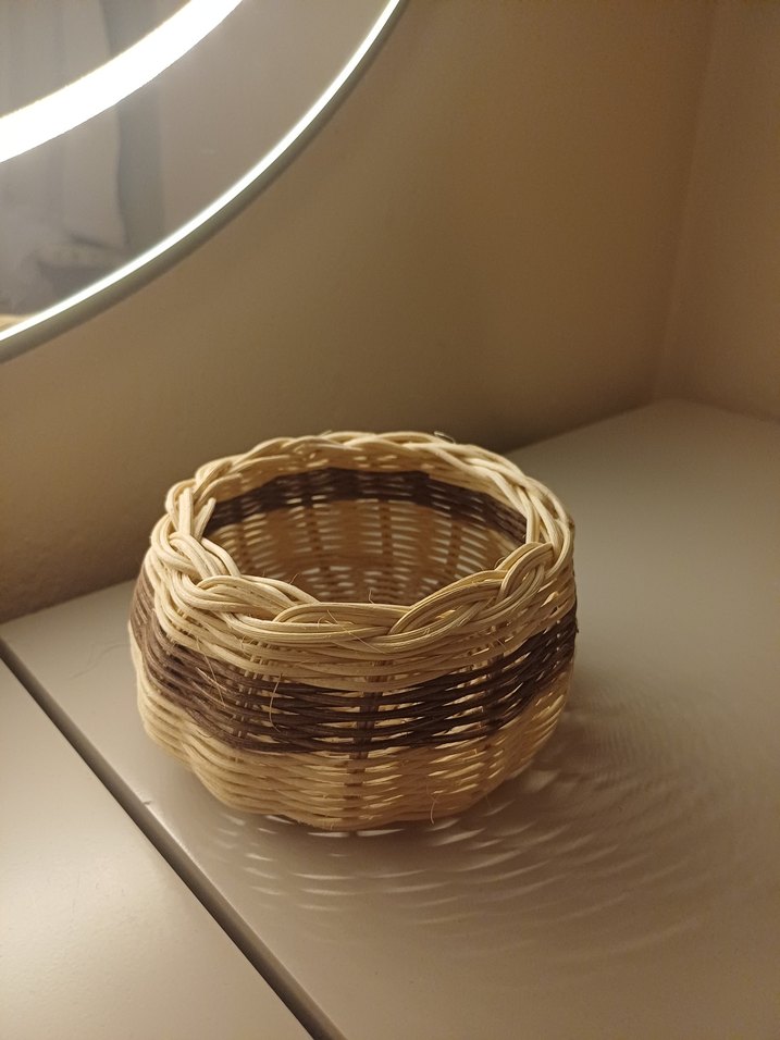 Hafif renk tonunda, küçük eşyalar için uygun bej renkli örgü sepet.