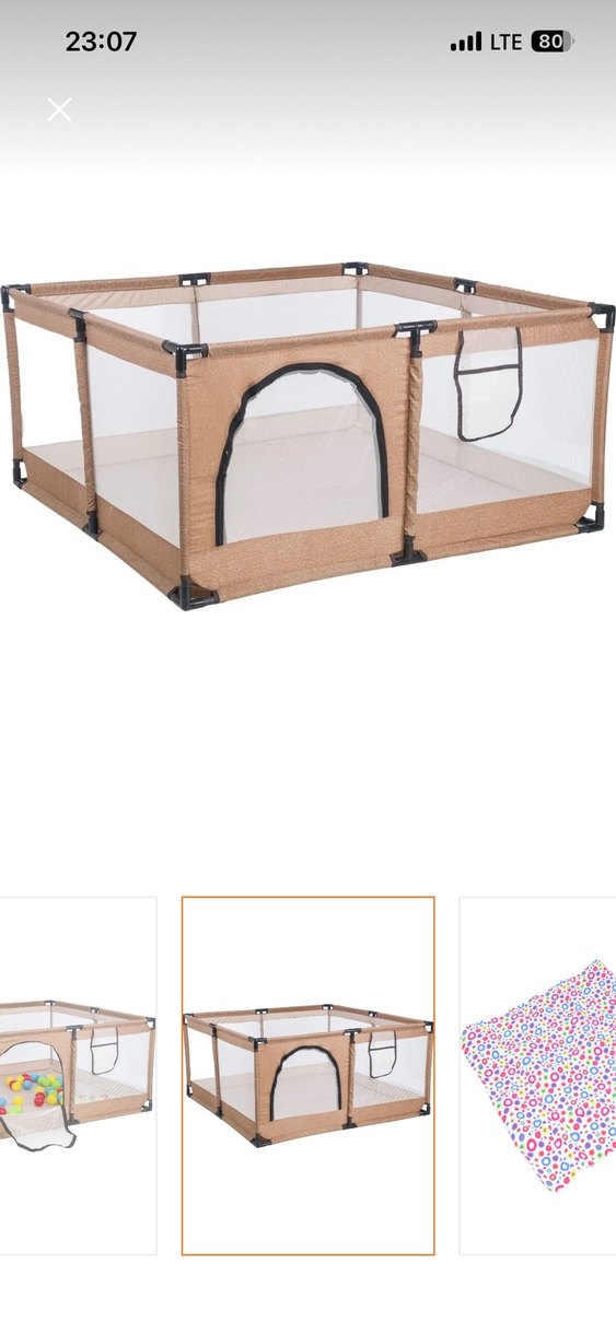 Bej renkli oyun parkı , file yanlar ve kolay erişim için fermuarlı kapı içerir. Çocuklar için güvenli ve konforlu bir alan sağlar. ️