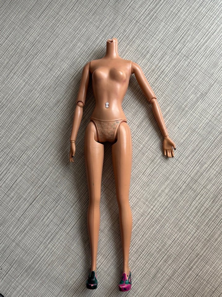 Açık bej renkli oyuncak bebek gövdesi, hareketli kollar ve bacaklara sahip, ayakkabıları farklı renklerde. Baş kısmı yok.