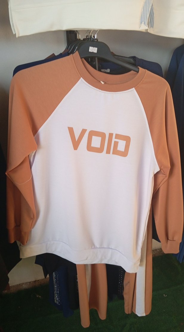Bej renkli pamuklu sweatshirt, yuvarlak yaka ve uzun kolludur. Bol kesim ve kısa boyda, 'VOID' baskılıdır, rahat sokak stiline uygundur. s.m.l beden seçenekleri mevcut