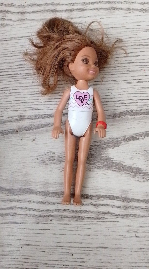 Bej renginde, beyaz kalp desenli elbise giymiş pastel bebek. Açık kahverengi saçlı ve kırmızı bileklikli.
