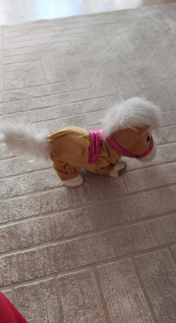 Takla atan Yumuşak dokulu bej renk peluş at oyuncak, beyaz kabarık yele ve kuyruk ile pembe koşum detaylarına sahiptir.