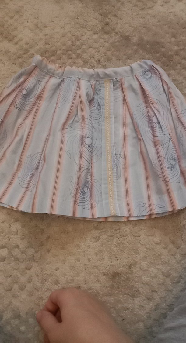 Bej renkte, pilili ve bol kesim mini etek. Sentetik kumaştan, pastel çizgili ve tüy desenli, bohem tarzı yansıtıyor. Günlük kullanım için uygun.