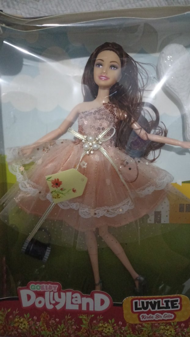 Bej renkli, pul işlemeli dantel detaylı elbise giymiş, uzun kahverengi saçlı ve gülen yüzlü bebek.