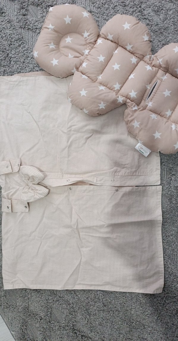 Yıldız desenli yumuşak sentetik kumaştan yapılmış bej renkli çift taraflı puset örtüsü seti.. Çarşafı da mevcut