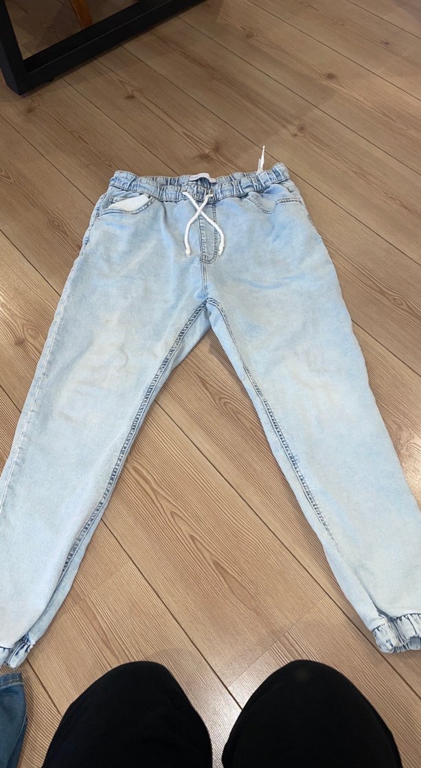 Açık mavi renkli denim kot pantolon, bol kesim, lastikli bel ve bilek detaylarıyla rahat bir sokak stili sunar. Midi boy ve desensiz tasarımıyla gündelik kullanıma uygundur.