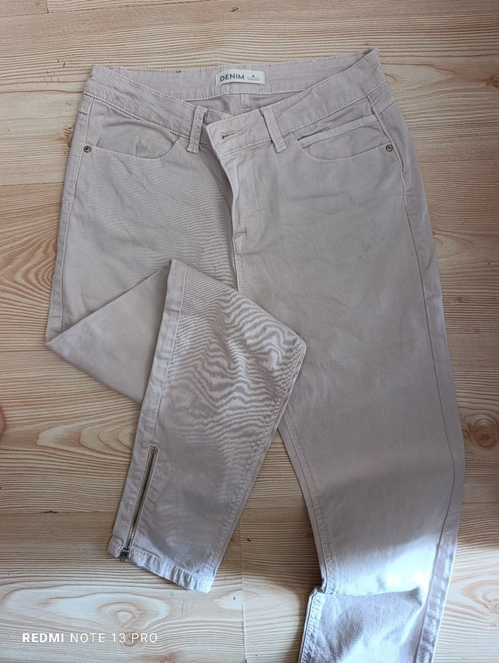 Bej renkli, regular fit kadın kot pantolon. Fermuarlı paça detaylı, midi boyda, günlük sokak stili için uygun.
