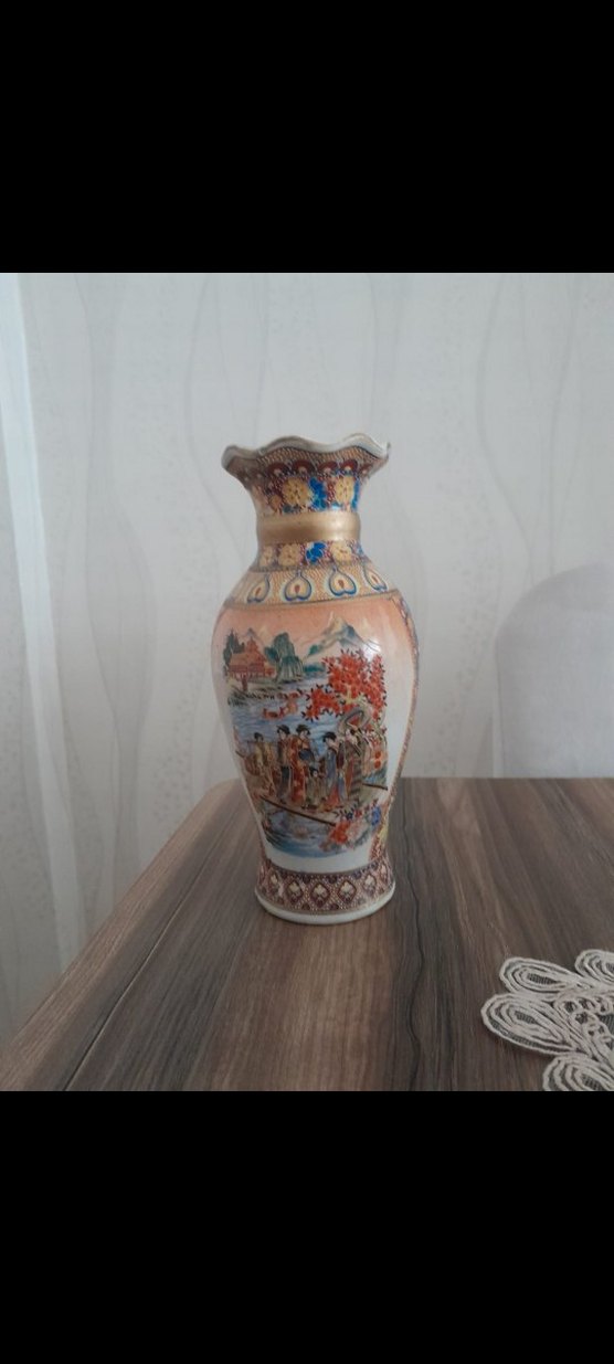 Bej renkte, geleneksel sahnelerle renkli desenlere sahip vazo. Dalgalı ağız kısmı ve detaylı motifler içerir.