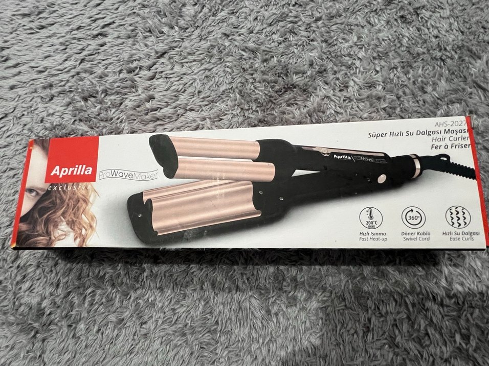 Parlak bej renkte, dalga yapmaya uygun çift varilli saç şekillendirici. Aprilla markalı ve hızlı ısınma özelliğine sahip.