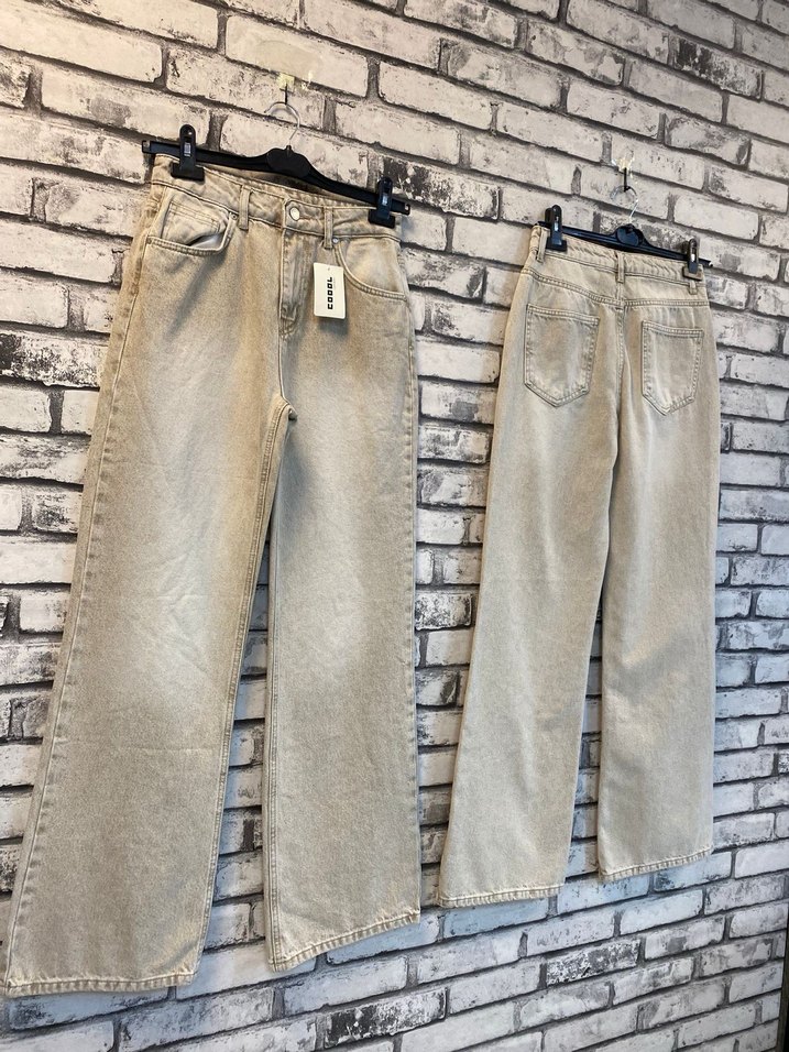 Salaş kesim, bej renkli denim kot pantolon. Normal midi boyda, desen içermeyen günlük rahat sokak tarzı için uygun.bedenleri mevcut
