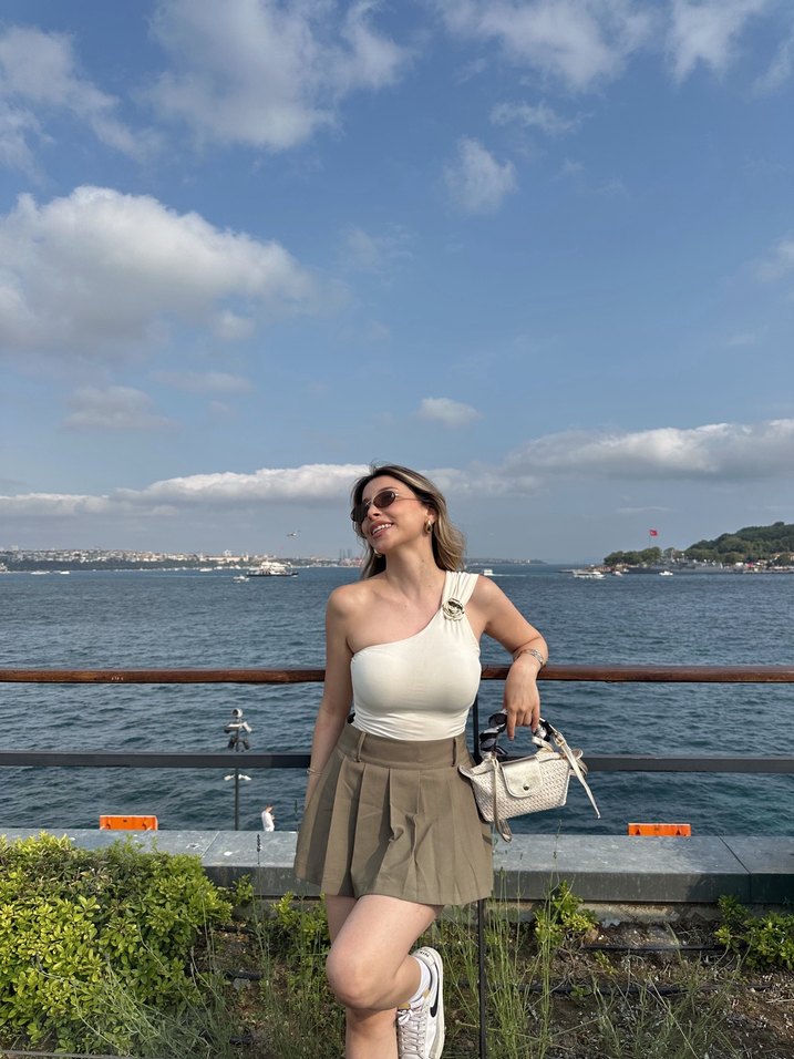 Bej renkli, salaş kesim ve düz desensiz mini etek. Sentetik kumaştan yapılmış, açık havada rahat kullanım için uygun.