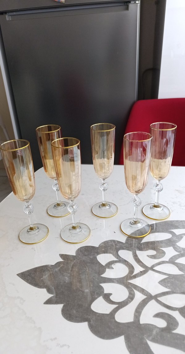 Bej renkli, açık tonlu ve altın detaylı şampanya kadehleri seti, şık sunumlar için uygundur. herhangi bir yerinde kırık veya soyulma yok iki kere kullanıldı alana şimdiden hayırlı olsun