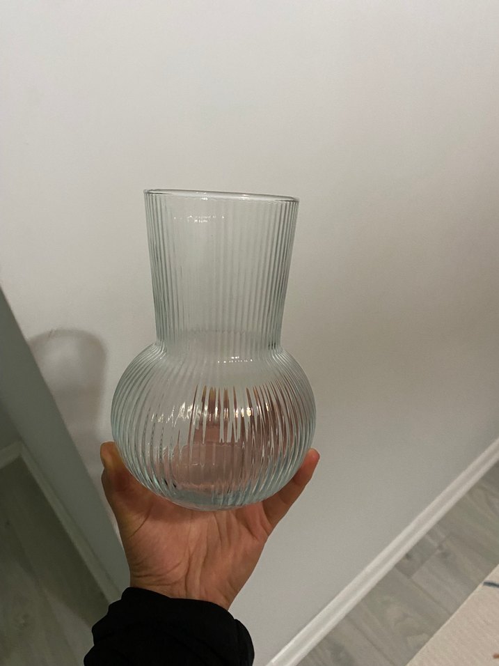 Dikey kabartmalı dokusu ve yuvarlak tabanı olan bej renkli şeffaf cam vazo. Dekoratif kullanım için uygundur. Ikea ürünü