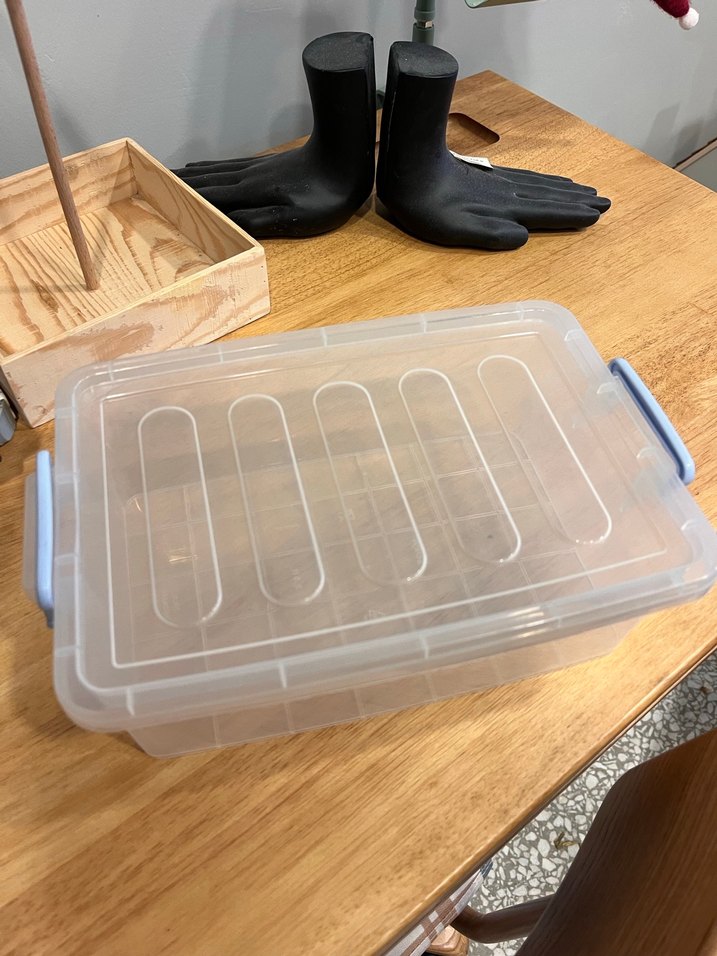 Yanlarında kulpları olan, kapaklı şeffaf bej renkli saklama kabı. Çeşitli eşyaların saklanmasına uygundur.