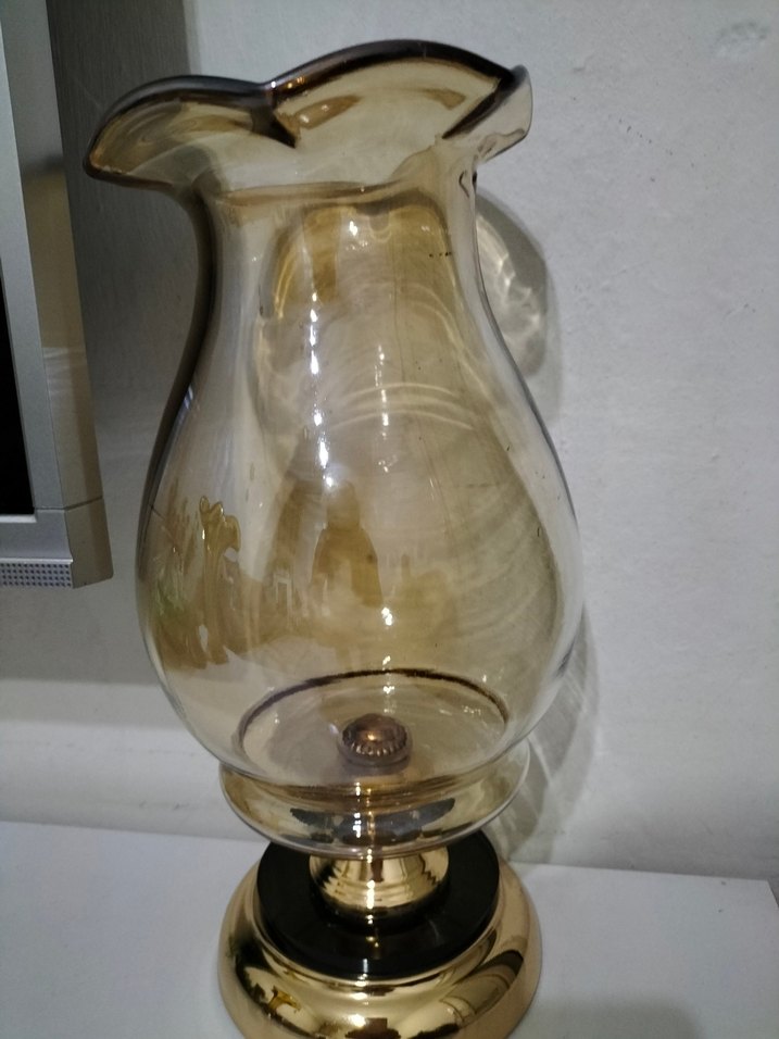 Şeffaf tasarıma sahip açık bej renkli şamdan yuvarlak gövde ve geniş ağız detaylarıyla şıklık sunar. Metalik tabanı sağlamdır.